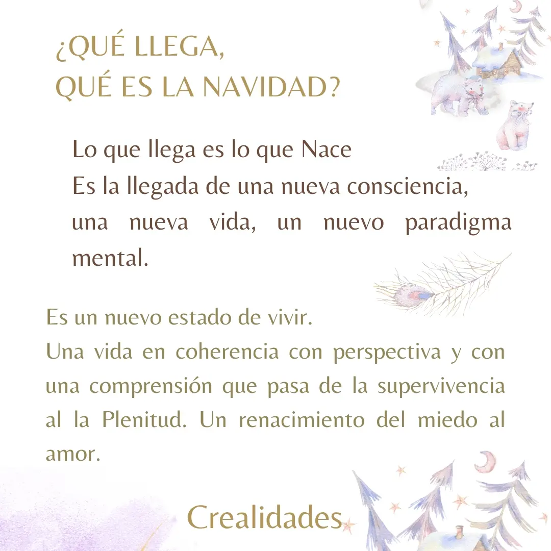 La Navidad es el nacimiento de la consciencia luminosa. La luminosidad es claridad, la claridad es Poder. El alumbramiento de tu Poder, es el recordatorio anual de quién eres. Una petición a que tu nivel de conciencia se expanda y te des cuenta de tu verdadera naturaleza y la marcha o muerte de tu falsa identidad, las falsas ideas limitantes de quién creías ser.