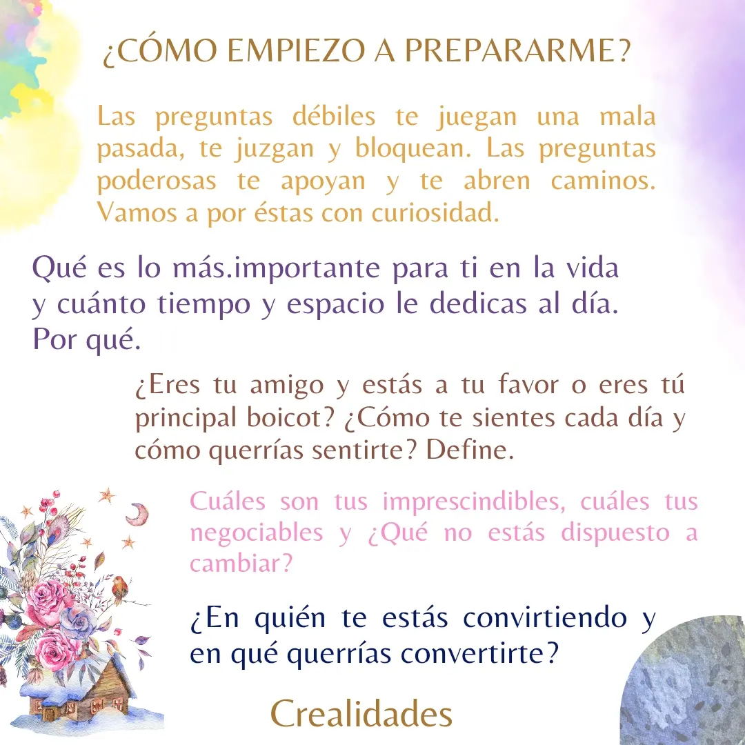 Después de conocer la diferencia entre las preguntas débiles y las preguntas que otorgan fortaleza, del primer ejercicio en las imágenes. Profundizaremos en una mayor introspección para prepararnos y potenciar el advenimiento de la vida de nuestros sueños en cada instante. Lo haremos con reflexiones mediante afirmaciones y, a través de un vídeo.